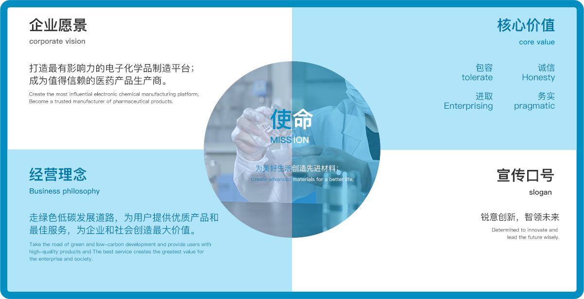 打造最有影響力的電子化學(xué)品制造平臺;成為值得信賴的醫(yī)藥產(chǎn)品生產(chǎn)商